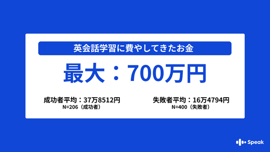 ・英会話学習に過去費やしてきた合計のお金事情を聞いたところ、成功者206名の平均が37万8512円、失敗者400名の平均は16万4794円と倍以上の差が生まれました。
