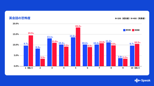 ・「英語を話すこと」に対する恐怖度を10点満点で聞いたところ、恐怖度が最大の「10点」と回答した人の割合は、成功者が9.7%、失敗者は10.5%とほとんど差が見られない結果となりました。