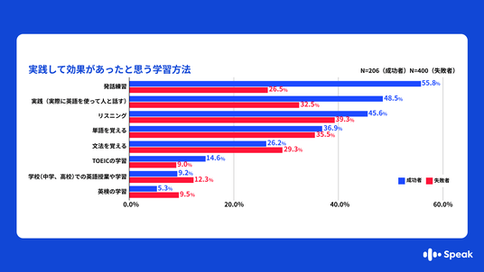 ・「効果があったと思う学習方法」についての回答も対照的な結果が見られました。 成功者が挙げた2トップは1位「発話練習(55.8%)」と2位「実践会話(48.5%)」であり、実際に英語を声に出すアウトプット型の学習を重視しています。