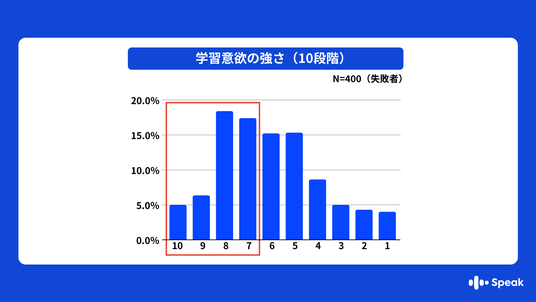 ・失敗者の学習開始時の意欲(モチベーション)は10点満点中「7~10点」の高得点者が多く、やる気不足が原因ではないことが伺えます。