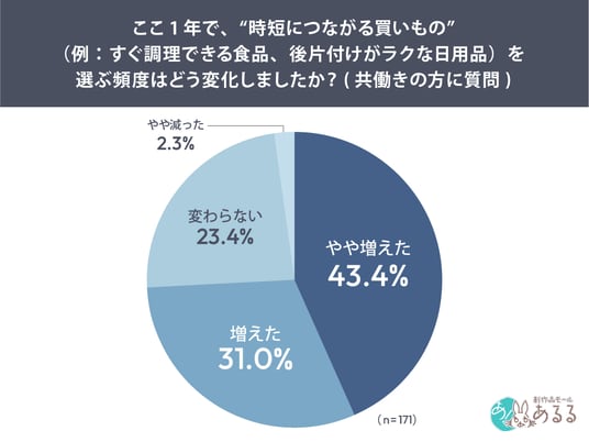 ここ1年での「時短につながる買いもの」の選択頻度について聞いたところ、共働き女性の74.4%が「増えた」「やや増えた」と回答しました。