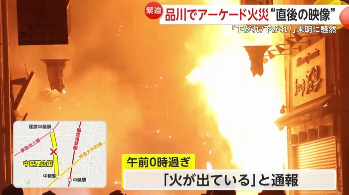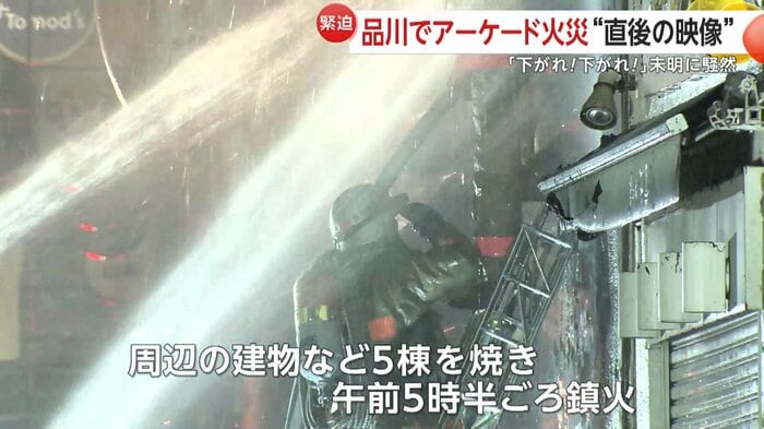 23日午前0時過ぎ、品川区の中延商店街で「火が出ている」と通報があった。警視庁などによると、火は酒屋から出たとみられ、周辺の建物などあわせて5棟が焼け、約4時間後にほぼ消し止められた。