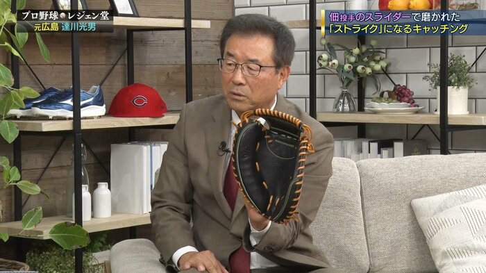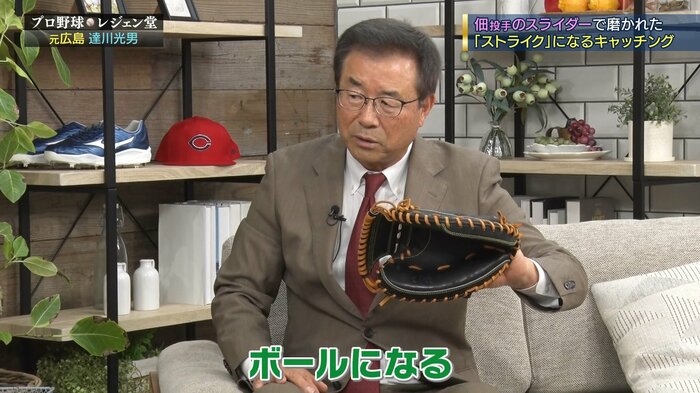 左のスライダーね、こうして捕るんですよ(ミットを左にずらして捕る)。