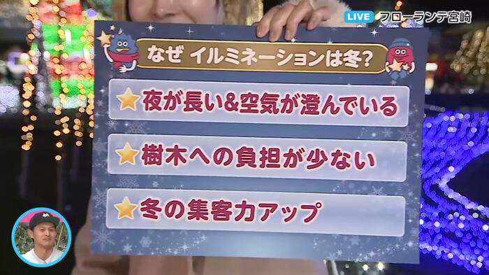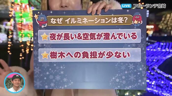 今回は宮崎市のイルミネーションの名所、「フローランテ宮崎」からお伝えしました。どうしてイルミネーションといえば冬なのか…古山予報士によると、その理由は大きく3つあるそうです。