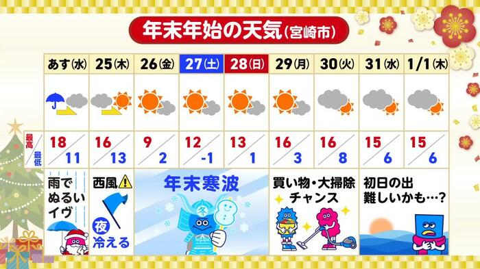 12月24日(水)クリスマスイブは、前線を伴った低気圧が九州を通過するため日中は雨が降りそうですが、気温は11月並みに高くなる予報です。一方、週末の26日(金)から28日(日)にかけては、強烈な寒波の影響で冬晴れとなるものの、厳しい寒さに見舞われるとのこと。