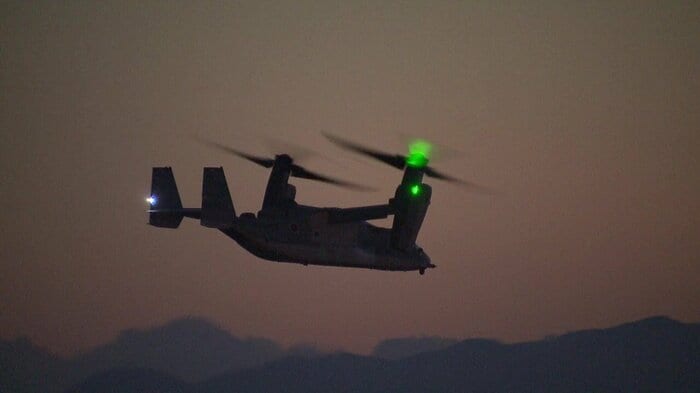 夜間訓練開始…夜空に舞うオスプレイ