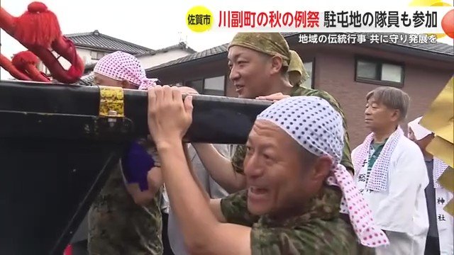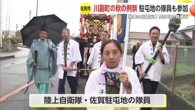 今年10月、佐賀市川副町の海童神社で行われた秋の例祭では神輿巡行に約20人の隊員が参加した。