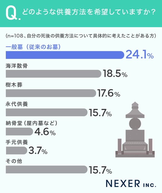 希望する供養方法は「一般墓」が最多でしたが、「樹木葬」や「海洋散骨」、「永代供養」など多様な選択肢に分散しています。