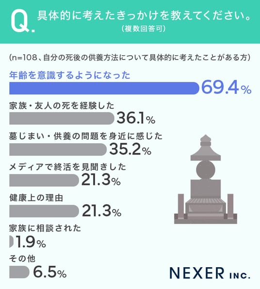 自分の死後の供養方法を考え始めたきっかけとして最も多かったのは、「年齢を意識するようになった」で約7割を占めました。
