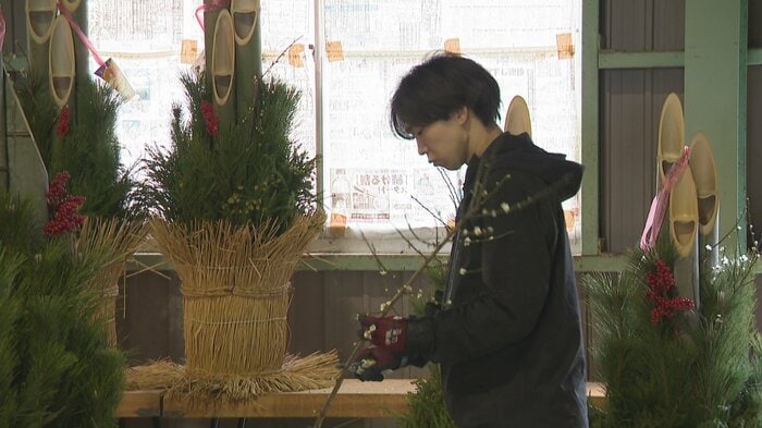 富山市の弥生園芸では高さ1.2メートルから大きいもので2.7メートルの7種類の門松を作っていて、24日は仕上げの工程として竹の周りに梅の切り枝を差し込む飾り付けが行われていました。