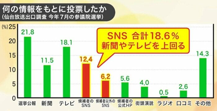 2025年7月の参院選における出口調査(仙台放送)では、「何の情報をもとに投票先を決めたか」という問いに対し、候補者とそれ以外のSNSを参考にとした人の合計が、ついに新聞やテレビを上回る結果となった。山口准教授は警鐘を鳴らす。
