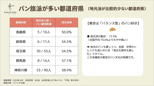 - 一方で、長崎県(50.0%)、埼玉県(54.5%)、神奈川県(58.9%)など、県外のパン屋も積極的に楽しむ「パン旅派」が比較的多い県も明らかになりました。