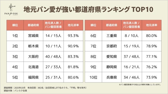 - 「地元パン愛」が最も強い県は宮城県(地元派率 93.3%)、次いで栃木県(90.9%)という結果になりました。