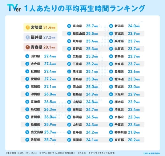 2025年1月1日から10月31日の集計における、1人(※4)あたりの平均再生時間(※5)は、2024年と同様に1位が宮崎県、2位が福井県となりました。上位を、複数の系列のネットワークに加盟しているクロスネット局のある県が占めたことから、居住地域の地上波放送では見られない番組もTVerを通じてお楽しみいただいている様子がうかがえます。