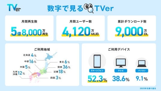 民放公式テレビ配信サービス「TVer(ティーバー)」は、2025年の利用状況や利用動向を数字で振り返る「数字で見るTVer」を公開しました。