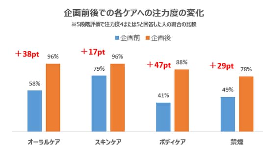- 企画前後でのケアの注力度合いを5段階で取ったところ、オーラルケア・スキンケア・ボディケア・禁煙のすべてのカテゴリーにおいて、注力度が上昇した。特にボディケア・オーラルケアでは注力度4または5(5段階評価)と回答人がそれぞれ41%⇒88%(+47pt)、58%⇒96%(+38pt)と増加し、企画が日々のケアの行動の変化に寄与したことが伺える。
