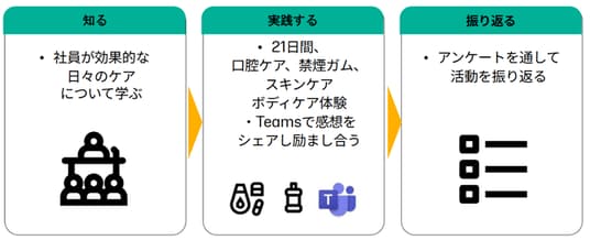 Kenvue(ケンビュー)は、社員が自らをいたわり健康について考える、セルフケアの習慣化・定着させることを目的に、マウスウォッシュ、スキンケア、ボディケア、禁煙補助剤の4ブランドを横断した「21日間セルフケアチャレンジ」を実施しました。本チャレンジは、「日々のケアがもたらす驚くべき力を解き放つ」というパーパスを掲げるKenvue社員自らが、1日1分でも自分の健康に向き合い、ケアする時間を持つことの大切さを理解し、実践することを狙いとしています。