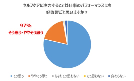 - ほぼ全員がセルフケア意識の向上を実感し、今後も日々のケアに注力していきたいと回答したほか、こうした日々のケアはウェルビーイングにも繋がっていると回答。97%が仕事のパフォーマンスにも好影響があったと回答した。