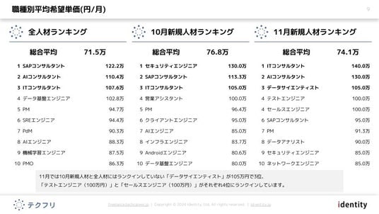 11月では10月新規人材と全人材にはランクインしていない「データサイエンティスト」が105万円で3位、