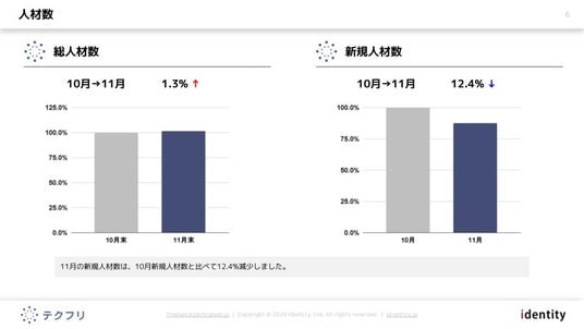 ITフリーランスエンジニアの案件・求人サイト「テクフリ」(https://freelance.techcareer.jp/)を運営する株式会社アイデンティティー(東京都港区、代表取締役:今野 力、以下「当社」)は、テクフリのデータベースをもとに2025年11月における人材の市況感を調査しました。より詳しい結果については、お問い合わせから資料請求が可能です。