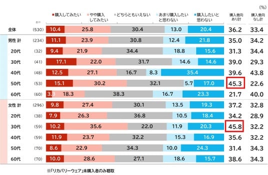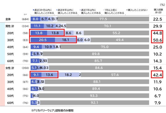 全体「購入経験あり計」は22.5%です。一方「未購入者の購入意向」は全体36.2%でした。 男性50代と女性30代で約45%あり、購入意向が高くなっています。男性20代で購入経験あり計44.8%、男性30代で購入経験あり計50.6%、女性20代で購入経験あり計42.4%と比較的若い世代の購入率が高い傾向にあります。また、男性20代、30代、女性20代ともに、購入経験者の過半数が直近3か月以内または半年以内に購入しています。