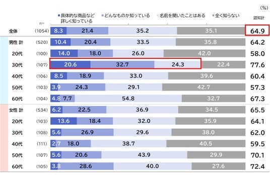 1.全体を通して、男性30代の関心の高さがうかがえる。また、40代以上より、20代30代の比較的若い世代の注目度が高い。全体の認知率64.9%、内容認知率29.7%に対して、男性30代の認知率77.6%、内容認知率53.3%と他世代より高い。また男性30代は購入経験、所有率ともに認知者の50.6%と最も高くなっている。