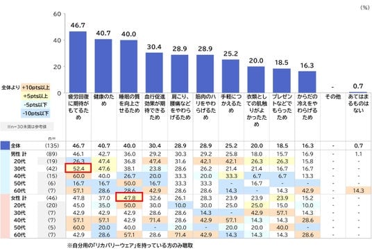 リカバリーウェアを利用している理由では、「疲労回復」46.7%、「健康のため」40.7%、「睡眠の質向上」40.0%となっています。中でも、男子30代は「疲労回復」52.4%と最も高くなっていました。女性では男性と比較し「睡眠の質向上」47.8%が高くなっており、期待している効果の違いがあります。