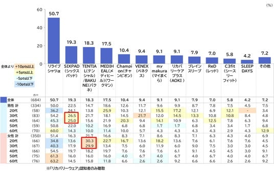 認知率の最も高いブランドは「リライブシャツα」で全体で50.7%となっており、すべての世代でトップです。特に女性50代、60代が認知率60%以上あり、他の世代より高くなっています。「SIXPAD」が男性30代26.5%、40代25.0%で他世代よりも高めです。「TENTIAL/BAKUNE」が女性20代30.3%、30代29.9%で、若年層での認知度が際立ちます。