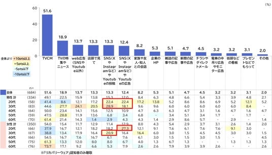 全体では「TVCM」51.6%と全世代で最も高い。 男女20代、30代では「SNSやYoutubeの投稿、広告」が20%以上と他世代が10%弱に対して高くなっている。