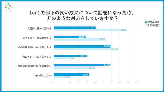 1on1 MTGで良い成果について話題になったときの対応については、部下の理想では「次に進めるための設計」を上司の現実より強く望んでいることがわかりました。具体的には、「今後の期待値の確認」は部下の理想34.2%に対し、上司の現実は25.3%で8.9ポイント上回り、「次の目標挑戦の話し合い」は46.0%に対し39.3%で6.7ポイントのギャップがあるという結果になりました。一方で「特に何もしない」は部下の理想が21.5%に対し上司の現実が10.7%で部下の理想が10.8ポイント上回り、過度に盛り上げず“静かに次へ”を好む層も一定数存在することが示唆されます。