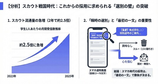 近年の新卒採用市場では、企業から学生に送られるスカウト数が急増し、いわゆる「スカウト戦国時代」に突入しています。