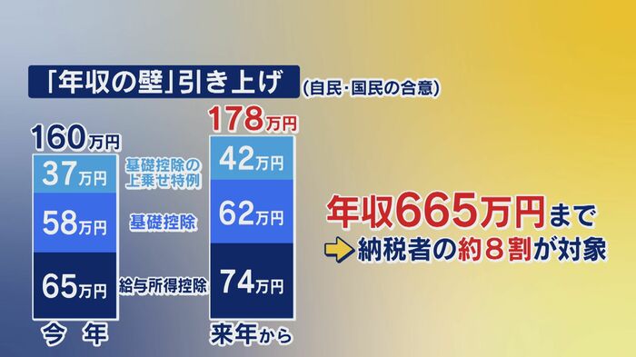 今回の合意では、物価上昇に合わせて控除額を増やすなどし、その上で対象を年収665万円まで広げることで、納税者の8割がその恩恵を受けられるようになるという。