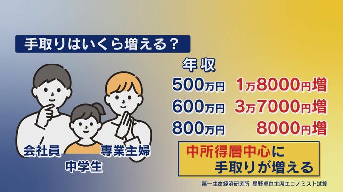 具体的には、会社員と専業主婦中学生の子どもの3人世帯の試算では、年収500万円だと1万8千円。600万円では3万7千円と中所得層中心に手取りが増える試算だ。