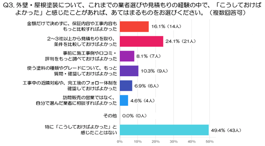 Q3. 外壁・屋根塗装について、これまでの業者選びや見積もりの経験の中で、「こうしておけばよかった」と感じたことがあれば、あてはまるものをお選びください。※Q1で「実際工事を行ったことがある/見積もりや相談をしたことがある」をと回答した人が対象(複数回答可:注2)