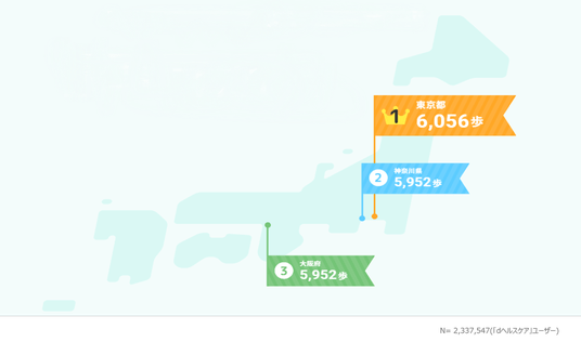 地域別では、東京都が6,056歩で最も高い結果に。都心部では交通インフラが発達している一方で、日常の移動距離が長く、通勤・買い物・余暇などの行動機会の中で自然と歩数が増える傾向が見られます。また、ウォーキングやランニングを日課にする層が多く、「健康意識の高さ」と「都市型ライフスタイル」が両立していることも、今回の結果を後押ししたと考えられます。