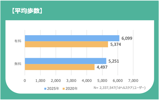 「dヘルスケア」では、有料・無料いずれのユーザーも歩数が増加傾向にあります。2025年のデータでは、有料版ユーザーが平均6,099歩、無料版ユーザーが5,251歩と、いずれも前回調査を上回り、無料版ユーザーでも歩数増加が見られました。