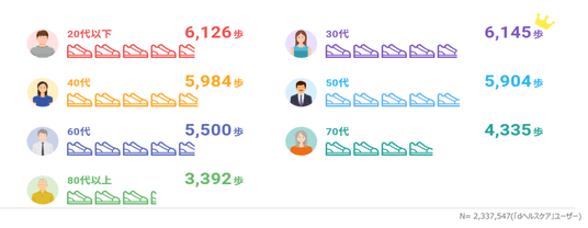 1.50~60代の平均歩数が5年で約20%増加