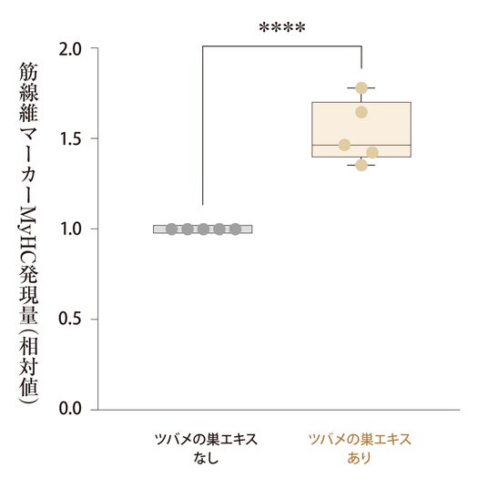 筋肉の元となる細胞(筋芽細胞)が、成熟した筋線維へ成長するプロセスである「筋線維分化」を促進する可能性が示唆されました。この分化の促進は、損傷後の回復速度や、新しい筋肉が作られることにつながると考えられます 。細胞実験では、ツバメの巣エキスにより、筋線維の成長を示す筋線維マーカーの発現が約1.5倍増加することが確認されました。