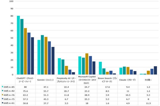 利用しているAIツールとしては、チャット・ジーピーティー(66.5ポイント)で、男女での差は認められませんでした。一方、2番手以下のツールでは性差が見られ、本設問が複数回答であることから、男性の方がジェミニやマイクロソフト・コパイロットといった複数のAIツールを使っていることが明らかです。