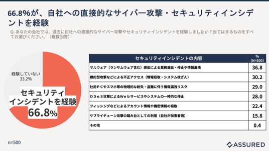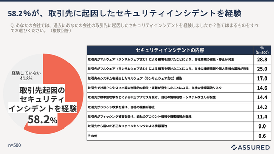 株式会社アシュアード(本社:東京都渋谷区、代表取締役社長:大森厚志)が運営するセキュリティの信用評価プラットフォーム「Assured」は、従業員数1,000名以上の大手企業に所属する情報システム・セキュリティ部門の方500名を対象に自社への直接的なサイバー攻撃やセキュリティインシデント、取引先に起因したセキュリティインシデントの経験有無ならびに経済的損失の実態を調査しました。