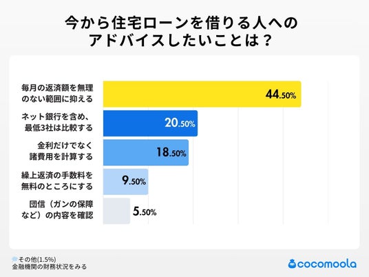 - これから借りる人へのアドバイスでは、「返済額を無理のない範囲に抑える」が44.5%でトップに。さらにお勧めの金利タイプは「固定金利」(43%)と「変動金利」(41%)で回答が割れており、昨今の金利情勢を反映して慎重な判断を促す声が目立っている。