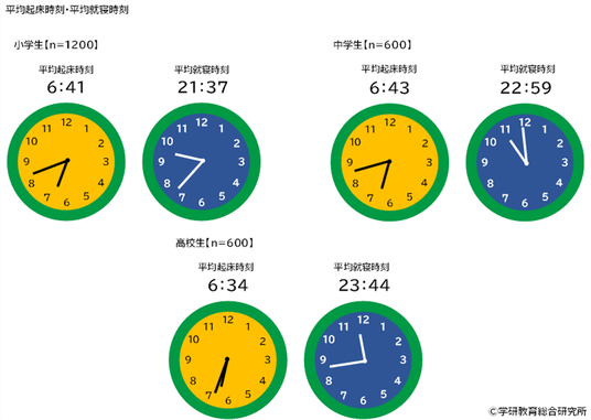 一方、寝る時間は、小学生では21:37、中学生では22:59、高校生では23:44と