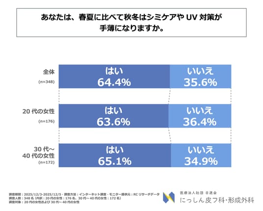 まず、「春夏に比べて秋冬はシミケアやUV対策が手薄になるか」を尋ねる設問への回答は、全体でみると「はい」が64.4%、「いいえ」が35.6%という結果になりました。年代別にみても、20代の女性と30代~40代の女性ともに「はい」と回答した方の割合は65%ほどであり、この設問では年代別での顕著な回答の差はみられませんでした。