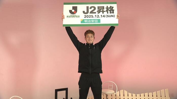 決勝戦後のチームと同じように、「オオオー!ヤー!」という掛け声で、橋本選手は少しはにかみながら、「J2昇格」のボードを高らかに掲げた。