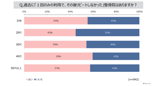 1. 1回のみの利用で、その後リピートしなかった整骨院がある方は55%。最大の理由は「施術の効果」への不満