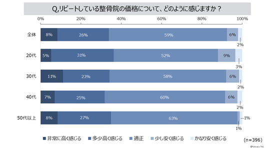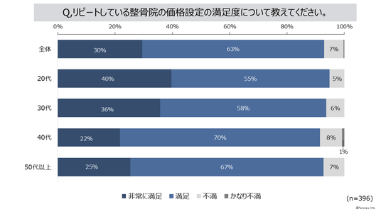 整骨院において、過去に1回のみの利用で利用をやめた経験がある方は55%でした。リピートしなかった理由については「施術の効果が感じられなかった」が57%と最多となり、身体の不調改善という目的において、期待した変化が得られないことが早期離脱に直結していることがわかります。一方で、現在継続して通っている理由については「施術の効果」が62%と圧倒的1位となりましたが、次いで「特定のスタッフとの相性・信頼関係」11%が「価格・コスパ」10%や「立地」8%を上回る結果となりました。また、リピーターの約9割が価格に満足する一方、離脱客の約3割は価格を負担視しています。