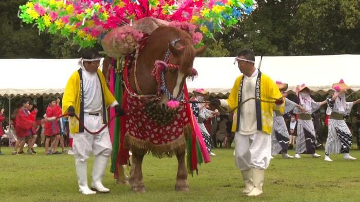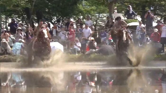 見どころは、2頭の馬が鞍をつけずに人を乗せて水田を駆け回る「牛馬入れ」で、しぶきを浴びると無病息災のご利益があると言われている。