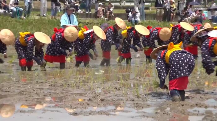 このあと神田では、早乙女姿の約150人がヒノヒカリの苗を丁寧に植えた。