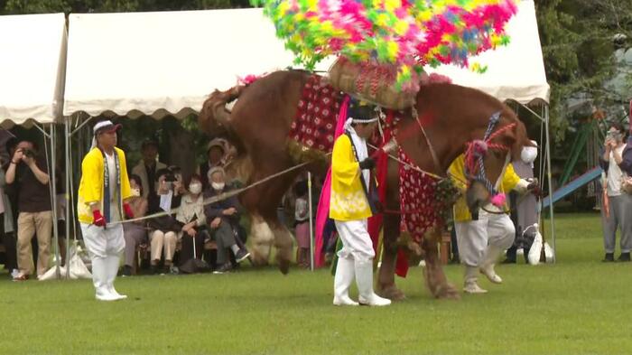 無病息災と五穀豊穣を願う「ジャンカン馬踊り」では、花飾りと鈴を付けた馬が三味線などの音色に合わせて、足を上げたり、首を振ったりして踊る。