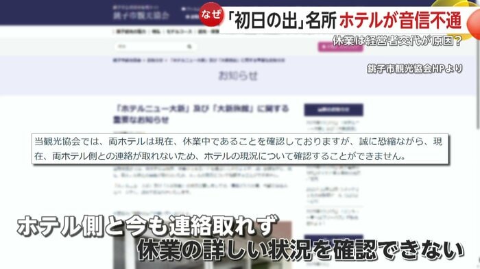 銚子市観光協会は、ホテル側と連絡が今も取れず、休業の詳しい状況を確認できないとしている。
